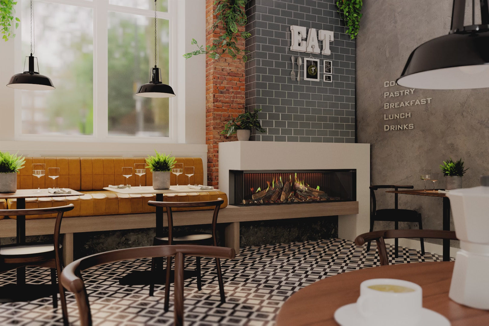 Tosidig hjørnepeis med naturtro flamme og arkitektonisk romfølelse