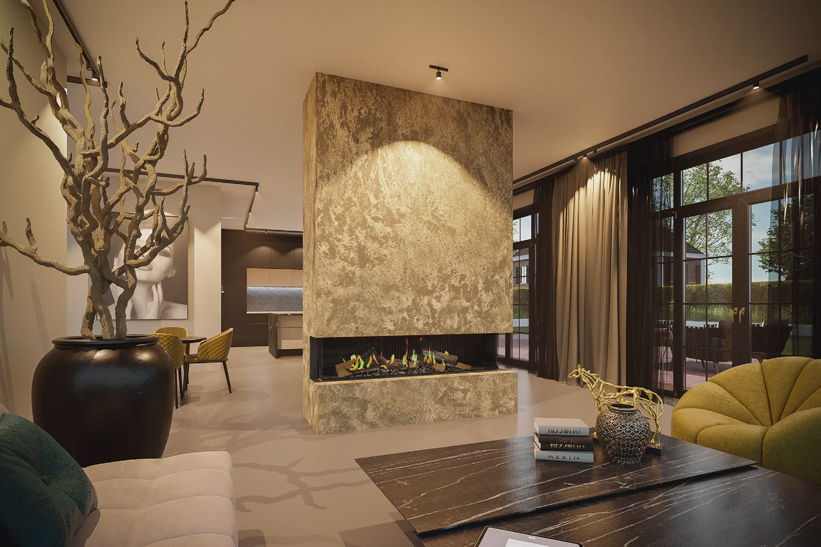 DRU Virtuo 180/3 Evolve kombinerer avansert flammeteknologi, moderne design og en av markedets mest realistiske elektriske flammer, helt uten pipe, ved eller forbrenning. Med bred panoramavisning fra tre sider skaper peisen et levende, eksklusivt og arkitektonisk midtpunkt hvor flammene oppleves fra flere vinkler.